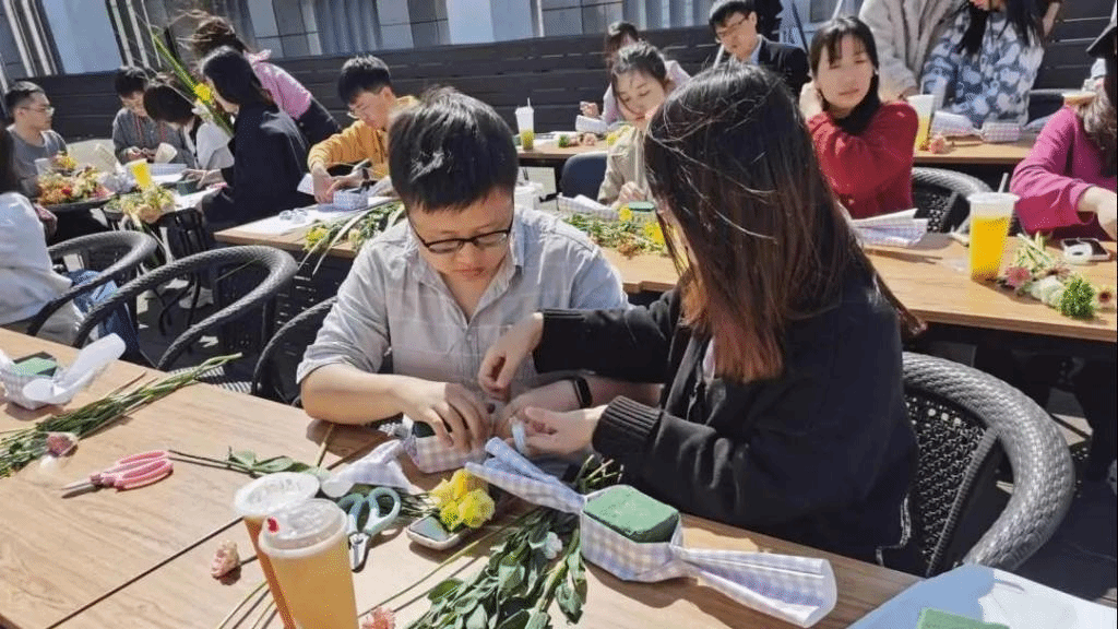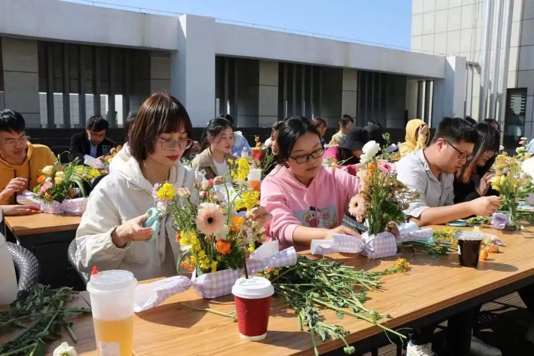 邓楠同学向大家简要介绍了插花的技巧,并指导员工动手插花。她从插花起源、花材认识到插花技法,向员工们展示了插花的魅力。她认为,七彩油菜花作为花材极具观赏性,既可作为主花也可当做点缀使用,十分富有特色。