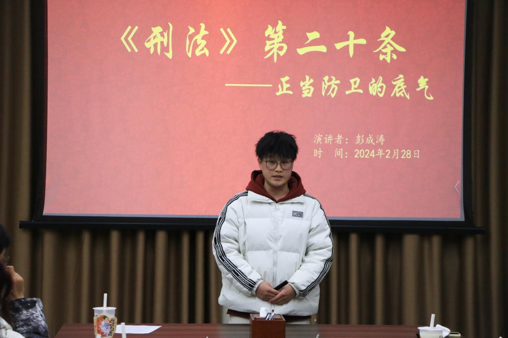 彭成涛以“《刑法》第二十条——正当防卫的底气“为题展开了演讲,他表示,法律是让坏人犯罪的成本更高,而不是让好人出手的代价更大!法,不能向不法让步!《刑法》第二十条的觉醒,是每个人期待公平正义的必然结果。面对不法,我们要有敢于反抗的勇气,敢于担当的道义,始终坚守凛然之气,弘扬社会正气。也许有人会觉得这个世界太黑暗了,很多时候将光明的范围越压越小。但是我们要相信光明固然存在,越黑,也就越亮。