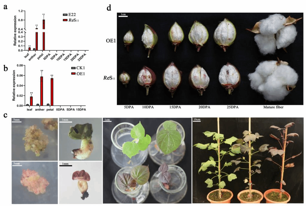 在实验室前期的研究中,在海岛棉3-79与陆地棉E22的杂交后代中发现了一个红株突变体,突变体全株呈现紫红色,但成熟纤维依旧保持正常白色。经过9代的连续自交,得到纯合突变体(ReS9)。利用ReS9与E22构建了含1899株F2隐性单株的群体,通过图位克隆,将候选基因锁定在D07号染色体上。通过代谢路径分析,表达量检测与TA克隆,最终确定候选基因为MYB113类的转录因子,命名为Re。利用35S启动子驱动Re转化Jin668,在组织培养的各个时期均观察到明显的花青素积累,得到叶片不同程度红色的转化系,但是最终成熟的纤维依旧为白色。